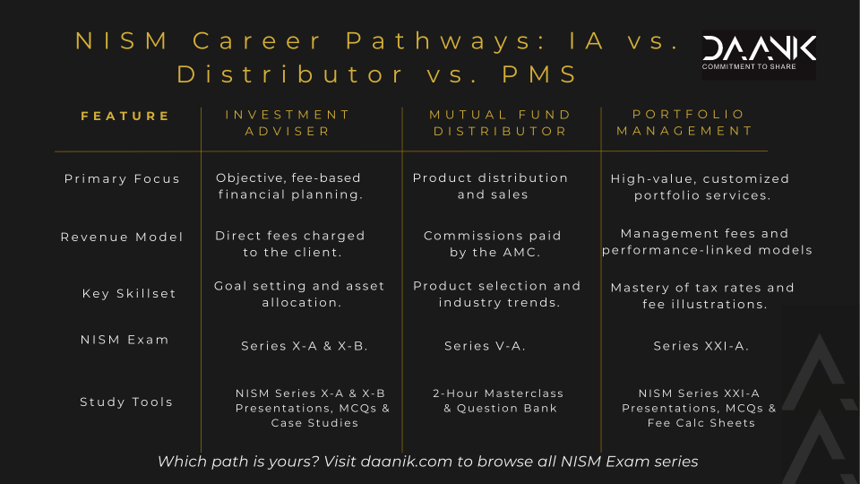 So, What Should You Do Next? The NISM Investment Adviser certification can be worth it if advisory work genuinely interests you. If not, there are other valid finance paths you can explore. Take time to understand the options, and choose a path that matches how you want to work and grow. If you want to explore different NISM career paths and understand the preparation structure for each, you can review the resources and courses available on Daanik and decide what fits you best.